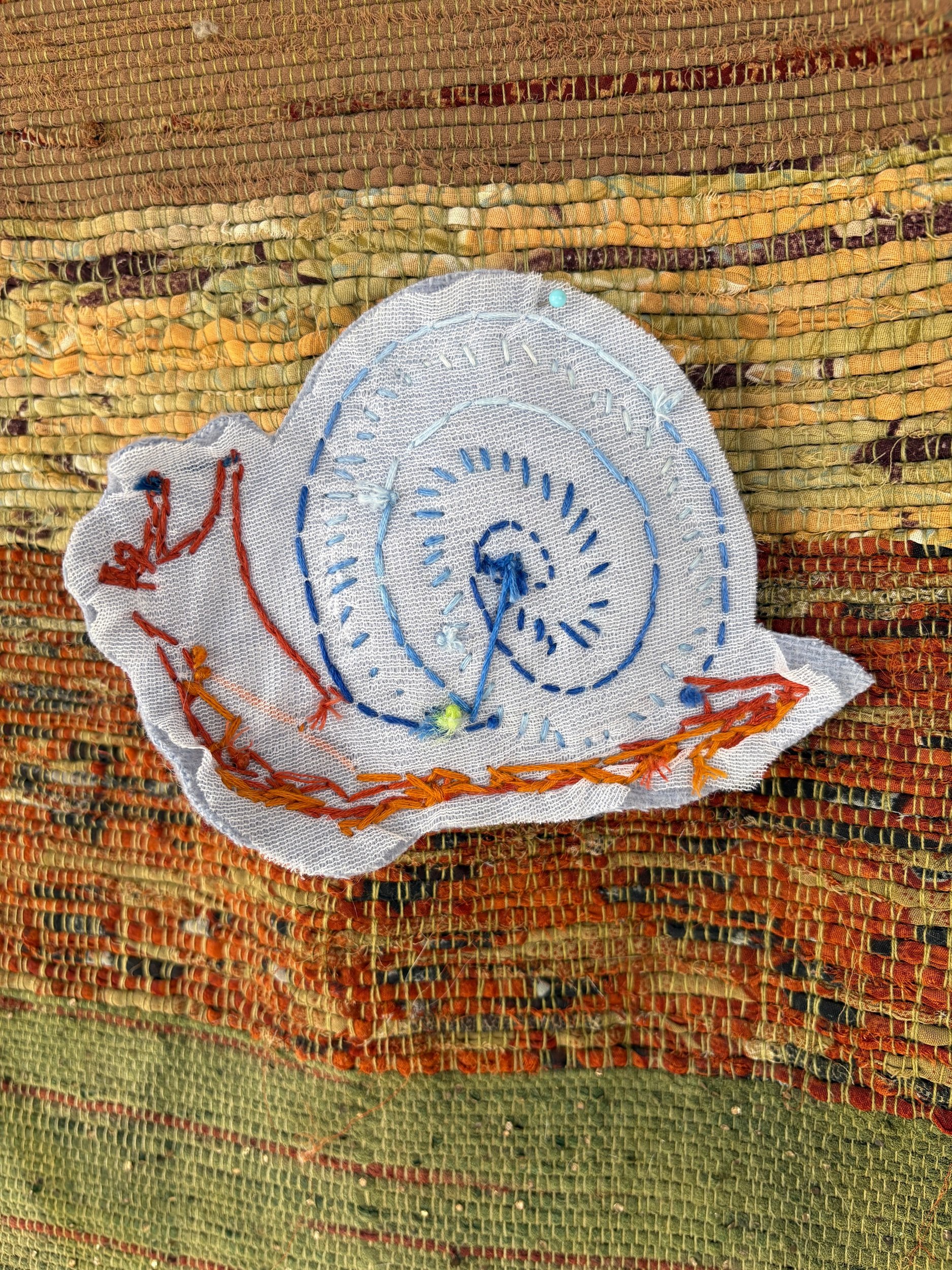 Patches escargot brodée à la main sur de la laine feutrée. J’utilise des tissus recyclés bien feutrés afin qu’ils ne s’effilochent pas. Cette patch est doublé d’un entoilage thermocollant, ce qui facilitera la couture. En le repassant au fer, il adhérera au tissu sur lequel vous l’apposerez. Vous pourrez ensuite le coudre ouu vous voulez ! Visionnez ma vidéo Patch 101 pour plus d’astuces !